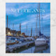 Malerei des traditionellen Fischerdorfes im Abend. Aussicht auf den Hafen von Volendam und die in den Niederlanden verankerten Yachten, Boote und Segelboote. Marine mit erhellten Häusern und blauem Himmel