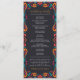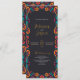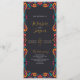 Dieses mexikanische Black Floral Traditional Folk Art Wedding Program besticht durch eine lebendige, blumengeschmückte Grenze, die einen fett schwarzen Hintergrund bildet und ein festliches und einladendes Erscheinungsbild schafft. Die Grenze zeigt eine symmetrische Anordnung von fett orangefarbenen, roten, rosa und blauen Blumen, die mit wirbelnden aquamarinen und orangefarbenen Schnörkeln, spielerischen Punkten und grünen Elementen besticht. Das Zentrum ist leer verlassen und bietet viel Platz für personalisierte Texte, während es elegant von den lebhaften, von Volkskunst inspirierten Mustern umgeben ist.