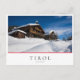Foto Postkarte von einigen Holzhütten oder schneebedeckten Chalets in einem Skigebiet in den Alpen in Österreich im Winter mit weißem Rand und in einem weißen Kasten mit dem Text "Tirol, Österreich". Die Karte hat rote, weiße und rote Streifen, die Farben der österreichischen Flagge.