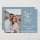 Elegantes Foto Save the Date, mit Ihrem Lieblings-Verlobung senkrechten Foto auf der links Seite, mit Ihren Hochzeitsdetails auf der rechten Seite, umgeben von weißem Rum. "Save the Date" erscheint in weißer Schrift Typografie über einem rauchblauen Hintergrund. Fügen Sie Ihren Namen und Ihre Details mit der Vorlage hinzu, die Karte kehrt zu einer passenden dustigen blauen Farbe mit Platz für zusätzlichen Text zurück.