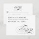 Eine traditionelle und elegante schwarz-weiße Kalligraphie Skript Hochzeit rsvp Karte. "UAwg"-Skript auf der einen Seite mit Antwort nach Datum, und Gastname und Anwesenheit, Wahl des Essens auf der anderen Seite. Löscht die Zeilen im Textfeld, die Sie nicht benötigen.