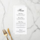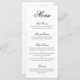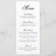 Elegantes und klassisches Hochzeitsmenü mit einem einfachen Design mit "menu" und den Kursleiter in einer formalen schwarzen Kalligraphie und Kursbeschreibungen in einem serifenlosen Schriftart über einem weißen Hintergrund. Ein traditionelles und elegantes Design, das sich perfekt für eine Hochzeit mit schwarzer Krawatte eignet.