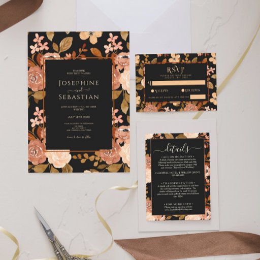 Eine elegante moderne Minimalistische Terracotta schwarz Burnt Orange Boho blumenreiche Hochzeitsfeier. Das Muster der botanischen Blume der botanischen Wildblumen ist in Aquarellborange gehalten. Mit formalen und beruflichen Schriftzypografien erdigen Töne und böhmischen Farben. Auf einem wirklich einnehmend schicken boho schwarzen Hintergrund. Und diese Einladungskarte ist erschwinglich und preiswert. Und es ist auch digitale elektronische e-Einladung. Alle Informationen können durch Anklicken des Buttons Personalisieren mit dem Bild angepasst werden. So packen Sie es und machen Sie es zu Ihrem, sodass Sie verlobt und aufgeregt einladen .