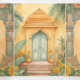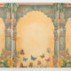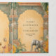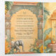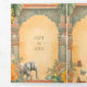 Verblüffen Sie Ihre Gäste mit dieser eleganten südindischen Themenhochzeitseinladung mit schönen traditionellen Säulen und vintage-architektonischen Elementen, verziert mit Ringelblumen und Bananenblättern.