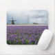 Mousepad mit einer Landschaft mit einer traditionellen Windmühle und mehrfachen modernen Windmühlen, zum der grünen Energie hinter einem Feld mit lila Hyazinthen-Blume in der Birnen-Region in Holland zu erzeugen.