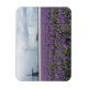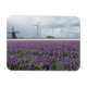 Souvenir Magnet mit einer Landschaft mit einer traditionellen Windmühle und mehreren modernen Windmühlen, um grüne Energie hinter einem Feld mit lila Hyazinth-Blume in der Bulb Region in Holland zu erzeugen.