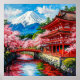 Schöne, traditionelle japanische Architektur, umgeben von Kirschblüten, einem ruhigen Fluss und einer Bergkulisse, die friedliche Harmonie in lebendigen Farben und kultureller Eleganz zeigt.