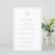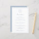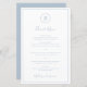 Einfache dustige blaue Hochzeitskarte mit dem Monogramm in einem Kreis oben und den Menüoptionen, die von einem dünnen Rand umgeben sind. Der Header und Ihre Namen befinden sich in einem eleganten, handgeschriebenen Skript-Schriftart. Das klassische, traditionelle Layout macht dieses Menü ideal für eine formelle Winterhochzeit. Diese günstigen Hochzeitsmenüs werden auf Papierblättern gedruckt, um eine preisgünstige Option zu erhalten.