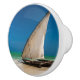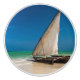 Traditionelles Fischerboot an einem weißen Sandstrand in Sansibar, Tansania.
