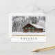 Foto Postkarte eines traditionellen Holzhauses mit grünen Fensterläden im Schneewald im Winter in Bayern, Deutschland, an der Grenze zu Österreich mit dem Text "Bayern, Deutschland" in einer weißen Box und mit Streifen in Schwarz, Rot und Gelb, die Farben der deutschen Flagge.