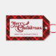 Ein klassisches kariertes Tartan-Muster hinter Ihrer frohen Weihnachtsbotschaft mit Ihrem personalisierten Familiennamen auf Geschenketiketten. Eine festliche, traditionelle Feier Gunst Tag.