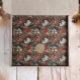 Ein traditioneller Blumendruck mit weißen Poinsettien und Pinecones auf Vintagem, leuchtend rotem Hintergrund.