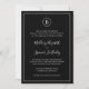 Einfache Einladung zum Hochzeitsfeiern mit dem Monogramm in einem Kreis oben und Ihren Hochzeitsdetails, umgeben von einer dünnen Grenze. Ihre Namen befinden sich in einem handgeschriebenen, eleganten Schriftart. Alle Designelemente sind auf schwarzem Hintergrund weiß und können im Designbearbeitungstool geändert werden. Das klassische, traditionelle Layout macht diese Einladung zu einer feierlichen Hochzeit.