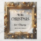 Ein klassisches Weihnachtsweinetikett mit vergoldetem Rahmen mit Ornamenten, Lichtern und Schnee.