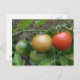 Diese schöne Postkarte zeigt ein Foto von einem Haufen reifer Tomaten, darunter eine Rot-, Orange- und Grünkirschtomate in einer Reihe, die auf einer Tomatennische-Pflanze in einem Vorstadtgarten wachsen. Das Foto wurde mit Makrofotografie für ein detailliertes Ergebnis aufgenommen.