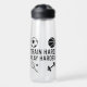 Bleibe mit diesem "Train Hard motiviert. Spielen Sie härter." Sportwasserflasche. Mit sauberen Typografie und Sportsymbolen - Fußball, Basketball, Tennis und Fitnessraum. Ideal für Training, Training und tägliche Hydratation.