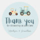 Niedlicher Traktorfahrer oder Bauernjunge Babydusche Danke an die Aufkleber für die Gefälligkeitstaschen! Dieses Design ist absolut bezaubernd. Es verfügt über niedliche kleine Traktoren in einem nahtlosen Muster auf einem hellblauen Hintergrund mit einem Bogen, in dem die Details des Party angezeigt werden. Der Slogan sagt: "Vroom, vroom! ...ein kleiner Traktorfahrer ist unterwegs." Das ist die perfekte Babyduschkarte für Traktorfreunde oder Bauer!
