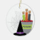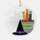 Korkierte Hexenkrüge, schwarzer Hut und Spinnennetz für Halloween.