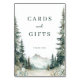 This wedding tabletop sign features a serene, nature-inspired landscape with tall evergreen trees framing a winding path leading to distant mountains. The design uses a calming color palette of cool greens, grays, and whites, creating a tranquil atmosphere perfect for expressing gratitude. Watercolor artistry brings the scene to life with soft blending and realistic yet stylized elements, while elegant typography highlights "Cards and Gifts" and "Thank You," adding a touch of sophistication. Ideal for weddings, this sign captures the beauty of the outdoors and sets a peaceful tone for your special day.