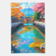 A serene Japanese town nestled beside a river with Mt. Fuji in the background and its reflection on the water.