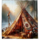 Eingebettet in einen Fluss, steht ein indischer Tepee stolz inmitten üppiger Bäume und majestätischer Berge und lädt zu friedlichen Reflexionen und einer tiefen Verbindung mit der Schönheit der Natur ein.