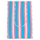 Fun gift bag in light blue, pink and white stripes, hearts and rainbows to stand for the transgender flag colors.