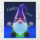 A sleek and contemporary 3D digital render of a stylized garden gnome figurine made from polished, translucent glass. The figurine features a tall, curved purple hat and a luminous white beard that glows with a soft blue light from the base. With its arms outstretched in a welcoming gesture, the gnome sits against a vibrant, deep blue gradient background. Customize it with a name of your choice.