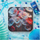 Eine Sammlung stilisierter Pappi mit durchsichtigen Blütenblättern in Blau, Rot und Weiß auf schwarzem Hintergrund