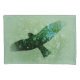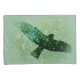 Dieses Set von Kissenbezügen hat mein verändertes Foto einer fliegenden schwarzen Krähe mit ihren Flügeln, die durchsichtig mit grünen Baumkronen auf einem hellgrünen Hintergrund ist.