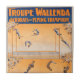 Vintages Zirkusposter mit Trapez, Akrobaten und fliegender Trampolin, um 1905.