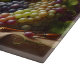 Schneidebrett mit einem klassischen Stillleben von Trauben und Wein. Genießen Sie die elegante Küchendekoration bei der Zubereitung der Speisen, die sich perfekt für Weinliebhaber und für diejenigen, die zeitlose Kunst im Alltag schätzen, eignet.