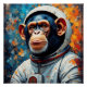 Ein als Astronaut verkleideter Schimpanse blickt nachdenklich in den Weltraum.