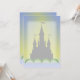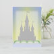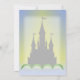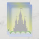 Ein magisches, traumhaftes Steinschloss in grünen Hügeln mit Türmen und Fahnen, die im blauen Himmel hochfliegen und das gelbe Sonnenlicht dahinter leuchtet. Ein originelles digitales Kunstdesign.