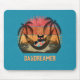Traumhaft Cooler Cat's Tropical Escape Mouse Pad: Eine schwarze Katze mit Sonnenbrille und hawaiianischem Shirt, die sich in einer Hängematte zwischen zwei Palmen mit einem Retro-Sonnenuntergang im Hintergrund befindet.