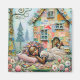Ein junges Mädchen mit bunten Blume in ihren Haaren schläft friedlich vor einem skurrilen Haus aus verschiedenen bunten Papierschrotten. Bäume schwirren und blühende Blume umgeben die Szene und schaffen eine traumhafte Atmosphäre. Digitale Kunstfotografie CS5