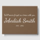 Dieses schlichte Begräbnis-/Gedenkgutachten-Gästebuch enthält die Meldung "Wir vergessen nie unsere Zeit mit dir", sowie den personalisierten Namen und das Geburtsdatum des verstorbenen Individuums. Es könnte genutzt werden, um hochgeschätzte Erinnerungen von jemandem aufzuzeichnen, der kürzlich weitergegeben wurde. Es hat einen braunen Hintergrund und weißen Text.