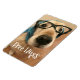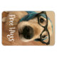 Dieser Magnet zeigt ein Foto eines traurig aussehenden Golden Retriever Hundes in Schwarz-Nerd-Brille und blauem Schal. Im Text steht: "Freie Hugs."
