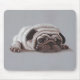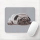 Ein Gouache-Portrait eines charmanten Mops, der mit einem traurigen und nachdenklichen Ausdruck liegt.