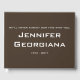 Dieses elegante Begräbnis-/Gedenkgutachten-Gästebuch enthält die Botschaft "Wir vergessen nie unsere Zeit mit dir", den personalisierten Namen und das Geburtsdatum des verstorbenen Individuums. Es könnte genutzt werden, um hochgeschätzte Erinnerungen von jemandem aufzuzeichnen, der kürzlich verstorben ist. Der Text ist weiß, der Hintergrund dunkelbraunlich grau.