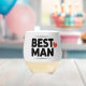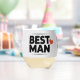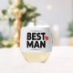 Das ist ein Trauzeuge-Edelweinglas. Rechts von den Wörtern Best und Man ist ein rotes Herz. Das Weinglas hat eine Kapazität von 16 Unzen. Dieses Edelwein-Glas eignet sich ideal für Junggeselinnen-Abschiede, Muttertag oder Buchklub. Das Weinglas wird in einem Getränkebehälter auf Veranstaltungsbasis geliefert. Es gibt ganzjährig verwendbare Hüllen. Die Abmessungen des stemlosen Weinglases sind 4,25" hoch und 3,375" Durchmesser.