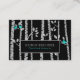 Eine Visitenkarte mit einem modernen, aber süßen rustikalen einzigartigen Design hat einen schwarzen Hintergrund mit Birkenbäumen und fallenden Blätter bevölkert.Niedlichen kleine türkisblaue Vögel und ein Paar blaue Liebe Pop vor dem schwarzen Hintergrund.Die Birkenbäume und die Blätter sind silbergrau und heben sich auf dem schwarzen Hintergrund hervor.