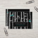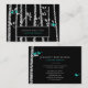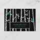 Eine Visitenkarte mit einem modernen, aber süßen rustikalen einzigartigen Design hat einen schwarzen Hintergrund mit Birkenbäumen und fallenden Blätter bevölkert.Niedlichen kleine türkisblaue Vögel und ein Paar blaue Liebe Pop vor dem schwarzen Hintergrund.Die Birkenbäume und die Blätter sind silbergrau und heben sich auf dem schwarzen Hintergrund hervor.
