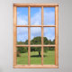 Entspannen Sie sich mit Blick auf einen Sommerbaum auf einem breiten, grünen Rasen, mit einem blauen Himmel und Wolken darüber. Dies ist eine friedliche Szene, die man aus einem Fake-Fenster sehen kann, ein Effekt, der durch die Aufnahme eines Holzfensterrahmens in das Foto entsteht. Erstellt einen Ausblick auf eine schlichte Wand, die Sie selbst zum Anzug bewegen können. Warum nicht ein bisschen ländliche Ruhe in Ihr Leben bringen und die Sommerzeit das ganze Jahr über genießen?