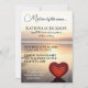 Treffen Sie mich am Meer und feiern Sie unsere Hochzeit. Diese wunderschönen Einladungen für Hochzeiten sind mit einem roten Glasherz versehen, das sich bei Sonnenuntergang im Sand am Ozean ruht. Gönnen Sie Ihren Gästen einen flüchtige Blick, was Sie von der Eleganz Ihrer Hochzeitsfeier zum Thema Strand erwarten.
