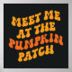 Dieses Design enthält die Phrase "Meet Me at the Pumpkin Patch", die in einem fett inspiriert Schriftart mit einem spielerischen, welligen Erscheinungsbild dargestellt wird. Der Text ist in einem gestaffelten, diagonalen Layout angeordnet und verleiht dem Design ein dynamisches und lebendiges Gefühl. Das Farbschema umfasst warme Herbstfarben, wobei die obersten Worte in goldgelber Gelb zu einer reichen Orange in Richtung des Untergrundes übergehen und so einen Gradienteneffekt erzeugen, der das festliche Herbstthema verstärkt.