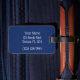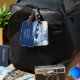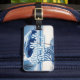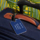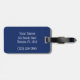 Blaue Strandlandschaft mit Liegestuhl und Sonnenschirm unter den Palmen, Blick auf das Meer. Der Rücken hat Ihre Informationen in Weiß auf Marineblau.