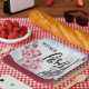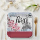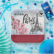 Die Papiertafel für Ihre nächste Unterhaltung. "Treffen Sie mich in Paris" Teller mit dem Eiffelturm, Kirschblüten und einer simulierten Portografie-Briefmarke, die lautet: "Made with Liebe". Ein hübscher roter Rand unten rundet das Design ab.