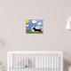 Dieser Hund im Schwarz-Weiß-Cartoon-Stil läuft um die Kugeln herum in diesem Hundesport von Treibball. Das einfache Poster ist hell und fröhlich mit dem Hund auf grünem Gras, knusprigen weißen Wolken, blau strukturiertem Hintergrundhimmel, Gelbsonne und Vogelfliegern.