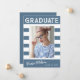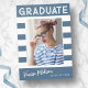 Trendige, fett gestreifte, Retro-Abschluss-Ankündigungskarten mit Designelementen aus Retrotext mit Handschrift. Das Foto der Absolventen ist mit fett weißen Streifen betont. Auf der Kartenrückseite finden Sie personalisierte Textstellen für Informationen über Ihren Abschluss und Ihre zukünftige Reise. Weiße Schrift auf chisch dusty blau oder leicht anpassen Sie den Hintergrund, um die Grundfarbe Ihrer Schule oder eine beliebige Farbe Ihrer Wahl. Perfekt für die Highschool, Uni und den Universitätsabschluss.
