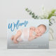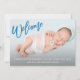 Diese moderne Baby-Geburtsankündigung bietet einen süßen "Willkommensgruß" in der Schriftzeichen-Schrift mit blauer Bürste und enthält ein Foto des Neugeborenen mit den Statistiken des Babys auf der Vorderseite der Karte. Die Rückseite der Karte ist massiv weiß, perfekt für einen kleinen Jungen.